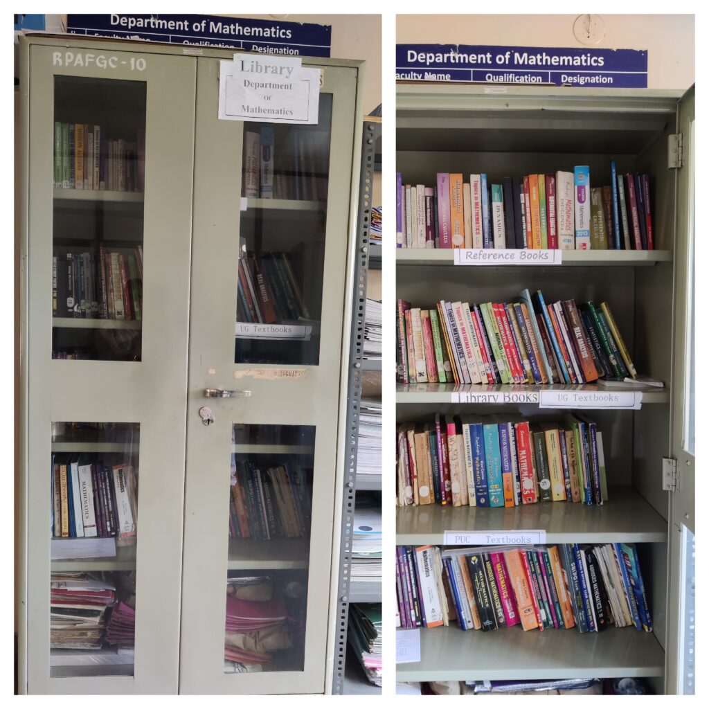 The Department of Mathematics has a well-maintained department library to support teaching, learning, and academic activities. The library contains a good number of textbooks and reference books covering core areas such as Algebra, Calculus, Differential Equations, Linear Algebra, Statistics, and Applied Mathematics. The department library also includes previous years’ question papers and competitive examination books, which are helpful for students’ academic progress and higher studies.